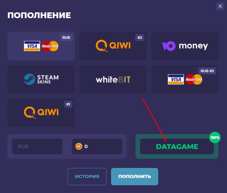 Для использования бонуса перейдите на сайте в раздел «Пополнение» и в поле промокод введите «DATAGAME» как показано на рисунке ниже.