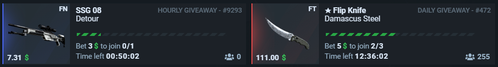 In addition to promotional codes on the site are regularly given out skins for betting on the jackpot. For the sake of fate, just fulfill the specified condition. For example, make three bets at $3 or similar.